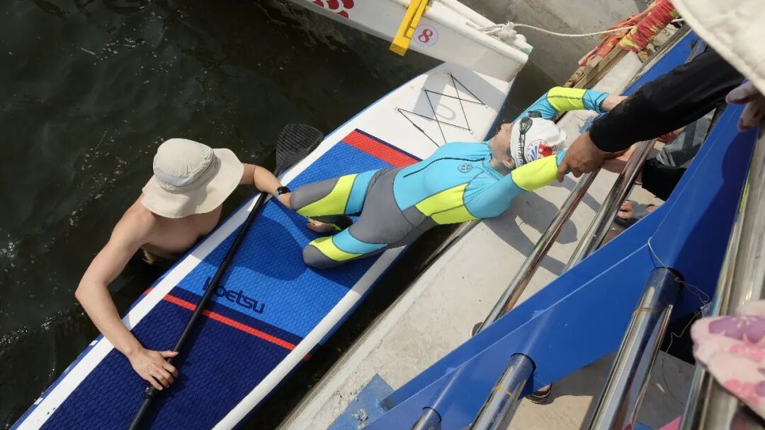 尤其是水上桨板船救援,一名年轻队员利用桨板船自身浮力原理,采取翻转船身的技巧将扮演落水者的志愿者翻至船上,赢得围观群众们的阵阵掌声。