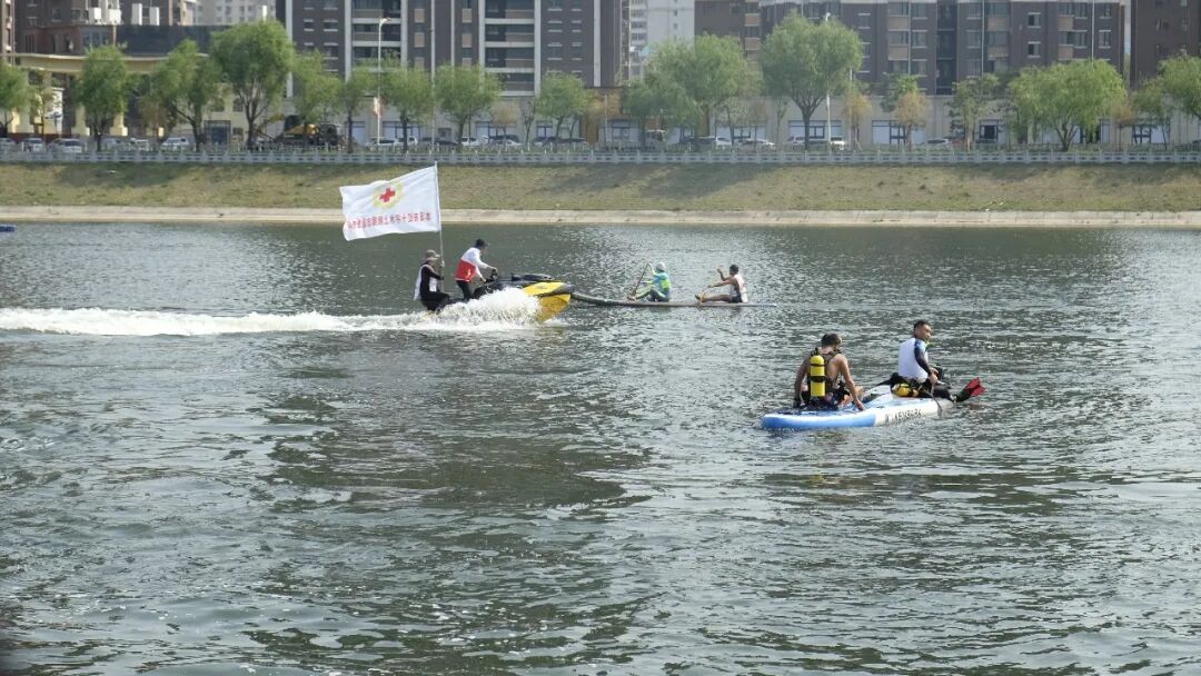 市应急管理局安全监察专员亲自莅临指导并参与指挥演练的进行,市红十字会秘书长、市游泳协会会长、市红十字水上应急救援志愿服务队队长进行现场指挥。在演练开始后,市红十字水上应急救援志愿服务队首先开展水面冲锋舟搜救演练。救援队队长王强一声令下,一艘摩托艇、三艘桨板船疾驰而出,按照“8”字型路线在河面上绕行,波澜起伏,场面壮阔。