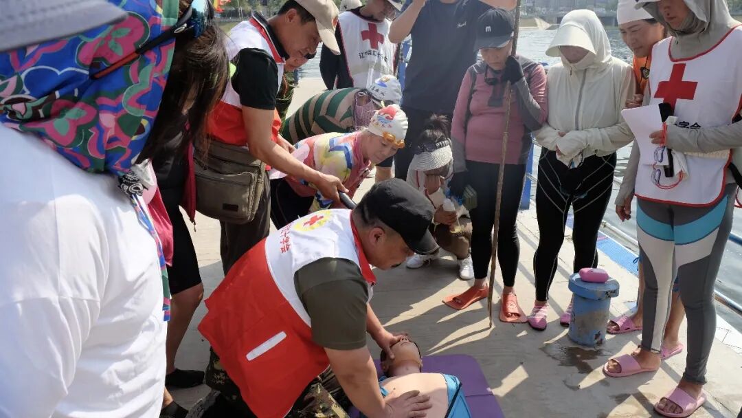 最后,由明山区红十字应急救援志愿服务队队长李东旭为在场队员和群众们模拟实操心肺复苏术,系统讲解溺水者打捞上岸后的注意事项和施救措施。