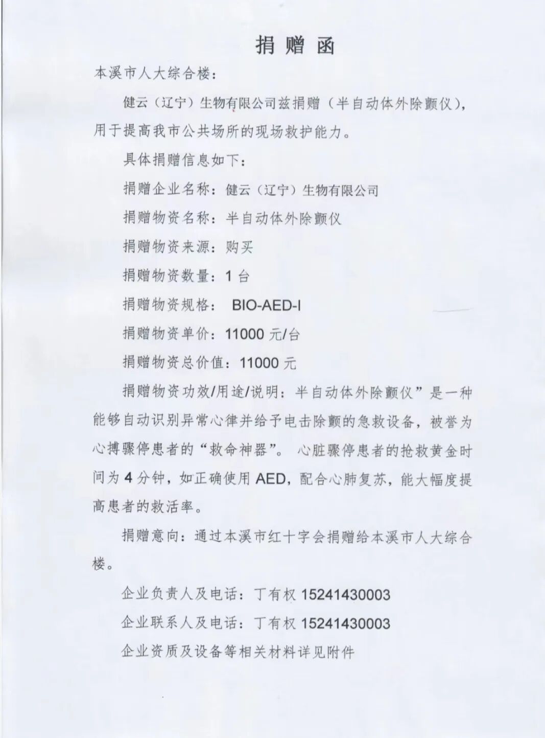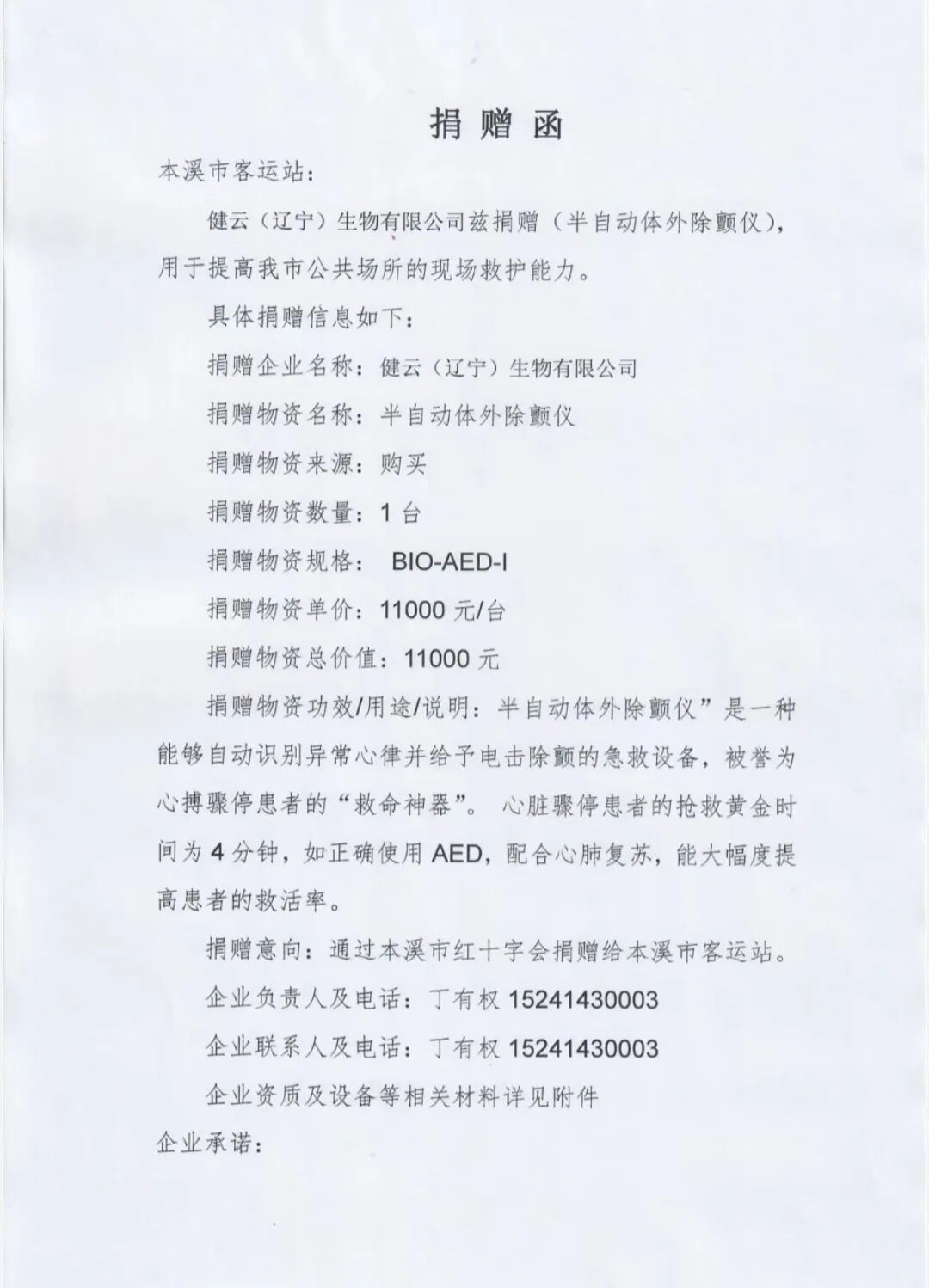 为织密本溪市公共安全防护网,让AED真正成为触手可及的“生命保障”,市红十字会秉持“人道、博爱、奉献”的核心精神,主动担当社会责任,积极沟通联络爱心企业健云(辽宁)生物有限公司捐赠AED事宜。健云(辽宁)生物有限公司慷慨捐赠3台半自动体外除颤仪暨AED,落户市火车站、客运站以及市红十字会(各一台),充分体现企业的社会责任感和爱心。8月20日,健云公司(简称)同市红十字会经过磋商后,出具AED捐赠函,正式启动捐赠流程,并计划于春运前夕安装就位。